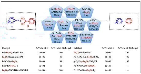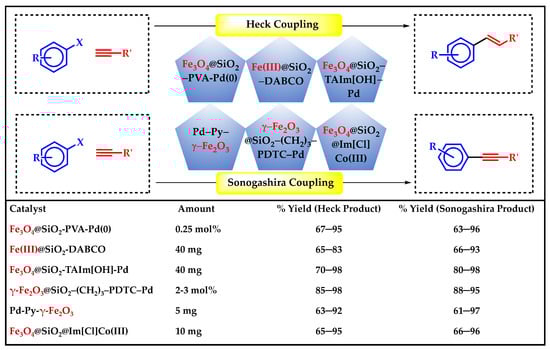 - Jang, S.; Hira, S.A.; Annas, D.; Song, S.; Yusuf, M.; Park, J.C.; Park, S.; Park, K.H. Recent Novel Hybrid Pd–Fe3O4 Nanoparticles as Catalysts for Various C–C Coupling Reactions. Processes 2019, 7, 422. [Google Scholar] [CrossRef]