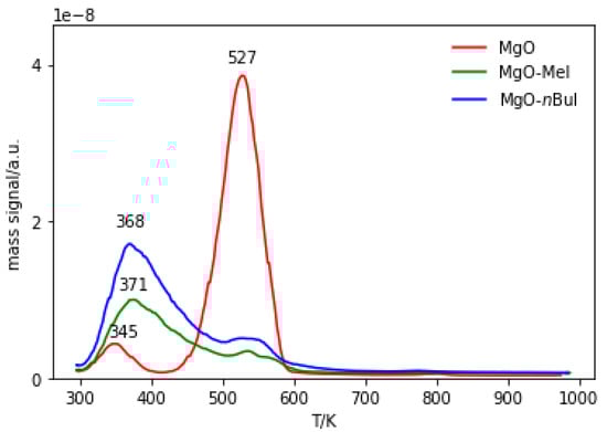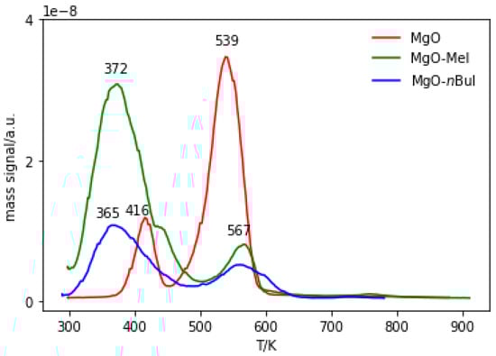 Four compounds were used as probe molecules for the TPD measurements: acetonitrile (MeCN), pivalonitrile (t-BuCN), triethylamine (Et3N)), and n-butylamine (n-BuNH2). Both of the nitrile molecules possess a lone electron pair that can react with low coordinated magnesium cations (Lewis acidic sites), but only MeCN can also probe basic sites due to the acidity of the protons of the methyl group caused by the electron-withdrawing properties of the CN group. The acidic strength of MeCN is comparable with that of acetylene, and for both compounds, the pKa value equals 25 []. Both nitriles can also exhibit basic properties because they can react with very strong Brønsted acidic sites. However, it does not happen in the case of pure MgO due to very weak Brønsted acidic properties exhibited by the surface of the oxide during the measurements of strength of its acidic sites (Section 2.3.2.). The pKBH+ values for t-BuCN and MeCN are −10.1 [] and −10.4 [], respectively. The pKBH+ values for Et3N and n-BuNH2 are 10.75 and 10.64, respectively []. The TPD profiles of pure MgO and modified MgO are presented in Figure 2, Figure 3, Figure 4, Figure 5, Figure 6, Figure 7 and Figure 8.