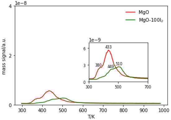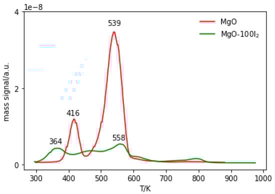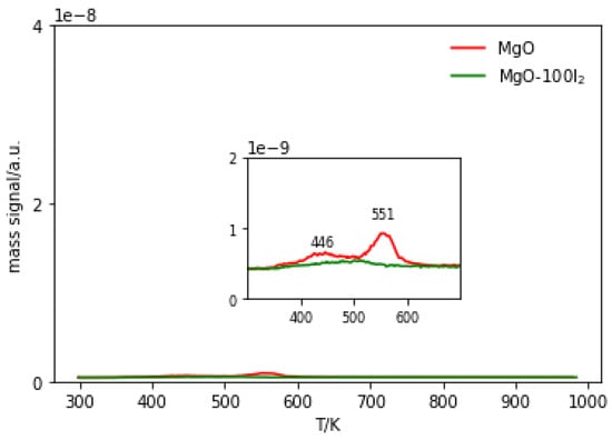 The signal with m/z = 29 could come from formaldehyde, but no signal with m/z = 30 was found in either preliminary or detailed studies, the presence of which would confirm the formation of this compound. Similarly, the presence of methanol, ethane, and ethylene was not detected. The absence of ethane in the reaction products indicates that the reaction does not proceed via the radical reaction pathway []. The TPD-MS measurement results are shown in Figure 10. The organic groups remaining on the MgO surface (e.g., OCH3) decompose at higher temperatures, which results in the desorption of hydrogen (m/z = 2), carbon monoxide (m/z = 28), and very small amounts of carbon dioxide (m/z = 44) at a temperature of about 800 K. The hydrogen desorption signal is the most intensive. The results obtained in the reaction of EtI and n-BuI with MgO analyzed using both methods (MS and TPD-MS) were not included in the work due to their complexity and difficulties encountered during the interpretation of the obtained data.