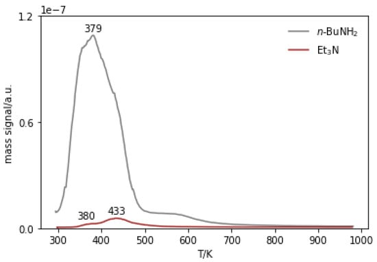 The very low intensity of the desorption peak of triethylamine at 433 K from the surface of MgO compared to the intensity of the desorption peaks of both nitriles is particularly noteworthy (Figure 6). What is more, a pronounced difference in the intensity of the desorption peaks of two amines, namely Et3N and n-BuNH2 from MgO, was also noted (Figure 7). The primary amine reacts with Brønsted acidic sites, also with Lewis acidic sites, and due to the presence of protons in NH2 group, it can react, and indeed, it does with the strongest basic sites classified as superbasic sites present on the surface of pure MgO. What is equally important, both amines show practically the same basicity measured by the value of the pKBH+: 10.75 and 10.64 for Et3N and n-BuNH2, respectively []. According to literature reports, the size of the bulky tertiary amine hinders the lone electron pair of the nitrogen atom from coming into the proximity of and reacting with a Lewis acidic site. This is why it preferentially reacts with Brønsted acidic sites, i.e., protons, rather than Lewis acidic sites, i.e., low coordinated Mg2+ ions. In the case of MgO, previous measurements excluded the presence of Brønsted acidic sites on its surface, hence the peak at 433 K must have a different origin. The behavior of Et3N in the case of adsorption on strong Lewis acidic sites is described in the literature []. As has been shown, the amine decomposition products of ethylene, hydrogen, and acetonitrile desorb from such sites at elevated temperatures. The authors propose the course of amine decomposition according to the following equations: