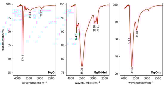 The FTIR spectra of MgO, MgO-MeI, and MgO-I2 recorded in the range of wave numbers from 4000 to 2500 cm−1 are depicted in Figure 11. The band at 3747 cm−1 was assigned to isolated hydroxyl groups and low-intensity bands in the range of 3000–2800 cm−1 are most likely related to the presence of vacuum grease (apiezon). In part of the spectrum of MgO (not shown in Figure 11), the presence of bands in the area of 1700–1200 cm−1 was also found, which were attributed to magnesium carbonates. After the reaction of MeI or I2 with MgO, the intensity of the band originating from free hydroxyl groups (3747 cm−1) decreased significantly. However, new, very intense bands appeared at 3500 and 3664 cm−1 for MgO-MeI and MgO-I2, respectively. In the spectrum of the former, one can observe multiple new bands related to the stretching vibrations of C-H groups derived from the modifier. Based on the literature data, the band around 2930 cm−1 can be assigned to methyl iodide. The complexity of the bands in the spectrum ranging from 3660 to approximately 3300 cm−1 indicates the presence of various types of hydroxyl groups formed on the MgO surface after its modification with MeI or I2.