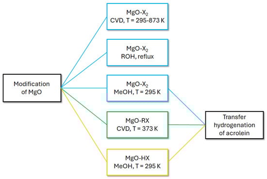 Magnesium oxide was treated with a number of modifiers: halogens (Br2 or I2) in the vapor phase or in solution in various alcohols, alkyl halides in the vapor phase, or hydrohalic acids in methanol at room temperature. Most of the new synthesized catalytic systems were subjected to activity tests in the vapor phase transfer hydrogenation reaction of acrolein with ethanol. For an easier overview of the research process in this work, the types of modifiers, the conditions of their reaction with MgO, and the types of catalysts tested in the above-mentioned reaction are summarized in the diagram below (Scheme 1).
