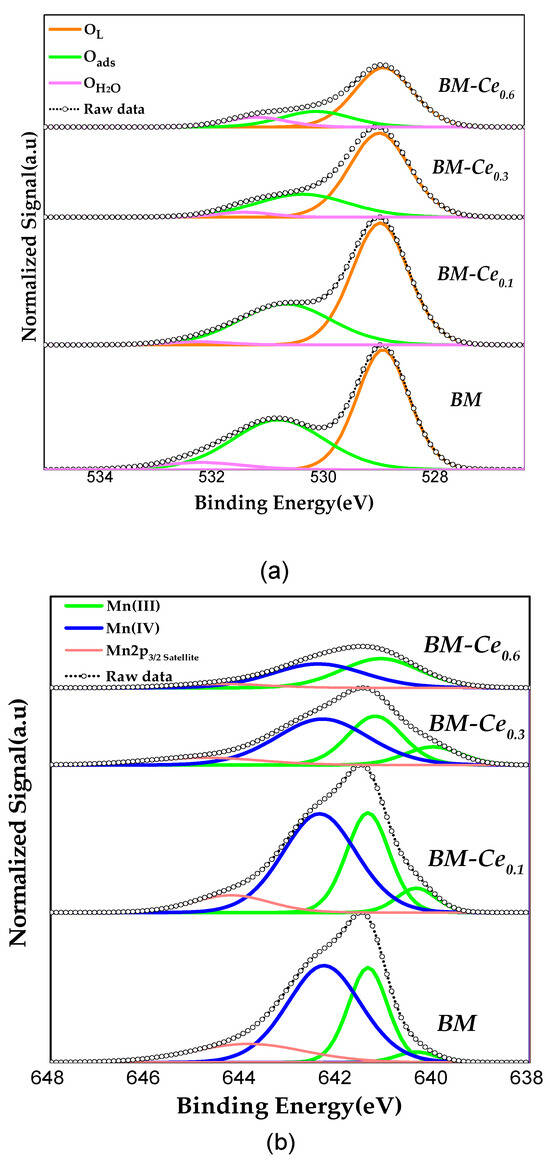 According to the literature, the assignment of the manganese oxidation states via XPS is a difficult task [27,28,29,30,31]; however, the raw data for Mn 2p3/2 spectra suggest the presence of Mn (III) and Mn (IV). Considering the asymmetric shape of the XPS signal, and based on the analysis of Ponce et al. for manganese-based perovskites [32], the two components of the Mn 2p3/2 spectra (Figure 2b) could be interpreted as follows: the deconvoluted peak at BE = 641.4–640.6 eV corresponds to Mn(III), and the observed peak at BE = 642.5–642.1 eV to Mn(IV). The presence of the satellite peak of Mn(III) at a binding energy of c.a. 644 eV allows us to confirm that Mn(III) exists on the surface. For BM-Ce0.3 and BM-Ce0.6 samples, a slight shift towards lower binding energies of Mn(III) with respect to BM and BM-Ce0.1 peak can be observed, which should be related to the increased amount of CeO2 detected via XRD. Thus, these spectra reveal that Mn(III) and Mn(IV) coexist on the surface of all perovskites [30,31,33], as these oxidation states allow for the surface to become electroneutral. Note also that for most of samples, Mn(III) shows two deconvolutions that reveal two different electronic environments, probably originating in the presence of oxygen vacancies and/or in the existence of Ce in different oxidation states, as it will be discussed below. The Mn(IV)/Mn(III) ratio values (calculated using the area under the corresponding deconvoluted XPS peaks and summarized in Table 3) decrease as the cerium percentage increases; so, the presence of cerium promotes an increase in Mn(III) on the surface with respect to Mn(IV), with this fact also being related to the electroneutrality (as Ce(IV)/Ce(III) is replacing Ba(II) in the perovskite formulation).Thus, Mn(IV) is the main oxidation state on the surface for BM and BM-Ce0.1, but it is Mn(III) for the other two samples with higher cerium percentages. Note that BM-Ce0.6 does not follow this trend, as the Mn(IV)/Mn(III) ratio increases with respect to BM-Ce0.3. So, as the ratio is close to 1, the surface of this sample should present an almost-similar amount of both oxidation states.