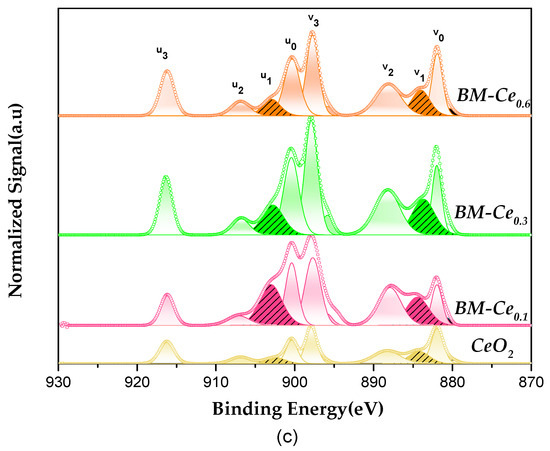 Figure 2c illustrates the XPS spectra corresponding to the Ce 3d orbitals. According to relevant literature [34,35,36,37], the deconvolution of these spectra reveals eight sub-peaks: four v quadruplets within the Ce 3d5/2 region and four u quadruplets within the Ce 3d3/2 region. Within these sub-peaks, the Ce(III) oxidation state is discernible through the two specific subpeaks v1 and u1, being the remaining sub-peaks associated with the Ce(IV) oxidation state. Thus, both Ce(III) and Ce(IV) are present on the surface of all BM-Cex samples, but as the Ce(IV)/Ce(III) ratios are higher than 1, this means that the amount of Ce(IV) is higher than that of Ce(III). The presence of the two valences of Ce on the surface seems to be relevant as it could enhance the oxygen storage capacity [9]. Moreover, as the Ce(IV)/Ce(III) ratio increases with the Ce percentage, the Ce(IV) proportion also increases from BM-Ce0.1 to BM-Ce0.6. This finding agrees with the XRD data, which reveal the prevalence of CeO2 in the bulk of samples as Ce content increases.