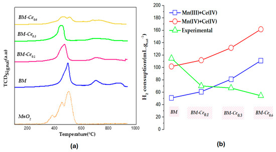 (a) H2-TPR profiles of BM, BM-Cex samples, and MnO2 as a reference; (b) H2 consumption (mL g−1 of catalyst).