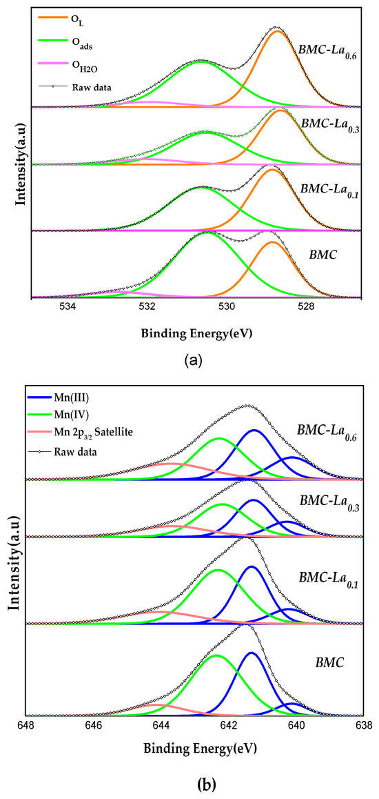 For perovskites, the O 1s spectrum (Figure 6a) could be deconvoluted into three peaks with maximum binding energies at around 528.5, 530.5, and 533.0 eV that correspond to [23,24,25]: (i) lattice oxygen (OL); (ii) adsorbed oxygen species (named “Oads”, which includes surface carbonate (CO32−), hydroxyl groups (OH−), peroxide (O22−) or superoxide (O2−) ions, and oxygen defect sites); and (iii) chemisorbed water (OH2O). After the addition of La, the area under the different deconvoluted peaks seems to have been modified. To analyze the effect of the different amounts of La in the lattice oxygen, the values of the OL/(Ba + Mn + La) ratio have been calculated using the area under the OL peak and the area of the peaks for the cations present on the surface. As all experimental values included in Table 6 are lower than the corresponding nominal value for ABO3 (1.5), this means that, as observed for BM-Cex samples, oxygen vacancies exist on the surface [23,24] of all perovskites. These vacancies are generated to achieve the neutrality of positive and negative charges on the surface of the samples because a defect in the positive charge exists due to the presence of Cu (II) and the coexistence of Mn(III) and Mn(IV) (see discussion below). Note that after the addition of La, the value only increases from 0.8 to 0.9, and it does not further change with the La percentage. So, the amount of lattice oxygen, and consequently, of oxygen vacancies, seems not depending on the increase in the La percentage in the samples.