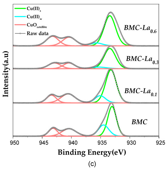 On the other hand, three peaks can be fitted for the Cu 2p3/2 (Figure 6c) spectra, with binding energies at around 933.0, 934.5, and 940.0–943.0 eV. According to the literature [21,31], these peaks are assigned to Cu(II) with strong (Cu(II)s) and weak (Cu(II)w) interaction with the perovskite surface for the two former, and to Cu(II) satellite peak for the latest. Upon using the area under the XPS signals for each metal, the Cu/(Ba + Mn + Cu) XPS ratio has been calculated. This value is compared in Table 6 with the nominal one in order to obtain information about the copper distribution. This is because, if the XPS ratio is lower than or similar to the nominal one, this means that copper has been inserted into the perovskite structure; and if it is higher, this implies that copper is being accumulated on the surface [21,31]. According to the data, the distribution of copper is affected by the presence of La, as an increase in the Cu/(Ba + Mn+ Cu) XPS ratio is found. This finding agrees with the XRD data that suggest a lower degree of copper insertion into the perovskite structure (as polytype structure is disfavored); so, the accumulation of copper on the surface increases with the percentage of La. Additionally, the ratio of the copper species with different interactions with perovskite () has been calculated considering the area under the corresponding deconvoluted peaks, and an increase with lanthanum content was also detected. Thus, even though the copper species have progressively accumulated on the surface, a strong interaction between these surface copper species and the perovskite is favored, presenting BMC-La0.6 with the highest proportion of Cu(II)s and BMC with the lowest one.