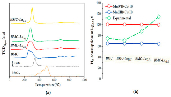H2-TPR tests were carried out to examine the reducibility of BMC-Lax samples, and the H2 consumption profiles are presented in Figure 7, where they are compared with the corresponding MnO2 and CuO (divided by 4 to obtain a similar peak intensity) used as references. As described above for the BM-Cex series, and considering the assignation of the peaks detected in the profile exhibited by the MnO2 and CuO references (see previous section for BM-Cex characterization), the three reduction peaks detected in the H2-TPR profiles of BMC-Lax samples correspond to (i) the high-intensity peak at the low-temperature region (200–400 °C), to the reduction of Mn(IV) and Mn(III) to Mn(II) and also of Cu(II) to Cu(0) [18,43]; (ii) the second wide and very-low-intensity peak at intermediate temperature region (700–800 °C), to the desorption/reduction of oxygen species; and (iii) the third peak, which is almost inappreciable for this series but usually appears in perovskites at the highest temperature (900–1000 °C), to the reduction of bulk Mn (III). Note that the addition of lanthanum at x > 0.1 provokes an increase in the intensity of the main peak; so, there is an improvement in the reducibility of the BMC-La0.3 and BMC-La0.6 samples with respect to BMC and BMC-La0.1. Additionally, a more-defined peak is featured for the former samples, which, in depth, is more similar to the one shown by CuO reference. This finding agrees with the XPS results (Figure 6c) that reveal a higher proportion of surface copper for these two samples. Focusing our attention on the temperature for the maximum of this peak, it is lower than that observed for the CuO and MnO2 references, revealing a synergetic effect between copper and manganese, which was previously found for other copper perovskites [31]. However, the temperature of the maximum is higher in the presence of La, and it increases with the La percentage (from 266 to 279 and 303 °C for BMC-La0.1, BMC-La0.3, and BMC-La0.6 versus 259 °C for BMC), suggesting that the presence of La decreases the Mn-Cu synergetic effect. The area under the hydrogen consumption profiles of Figure 7a was used to determine the experimental hydrogen consumption per gram of catalyst between 200 and 400 °C, which is compared in Figure 7b to the theoretical hydrogen consumption calculated considering the total reduction of manganese and copper—either as Mn(III) + Cu(II) (blue line) or Mn(IV) + Cu(II) (red line). Thus, it appears that the experimental H2 consumption is close to the nominal Mn(III) + Cu(II) for BMC and BMC-La0.1, and, after increasing the lanthanum percentage in the BMC-La0.3 and BMC-La0.6 perovskites, it progressively increases until nearing the corresponding nominal Mn(IV) + Cu(II). This trend suggests an increase in the amount of bulk Mn(IV) with the increasing lanthanum percentage in perovskite.