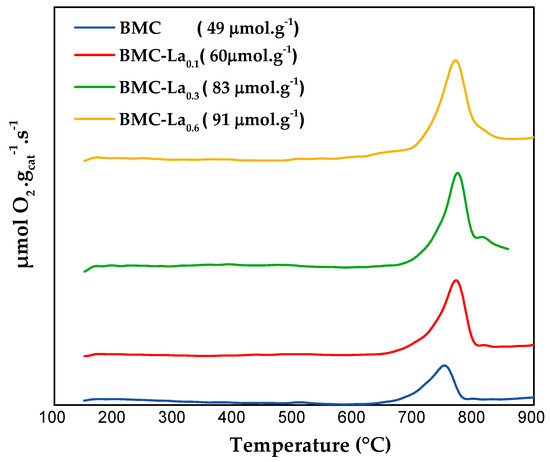 The information about oxygen mobility through the lattice is obtained from the O2-TPD tests [1,27,30], with the oxygen-evolved profiles for BMC-Lax being displayed in Figure 8. The samples do not evolve oxygen at temperatures lower than 650 °C, as only a desorption peak between 650 and 900 °C is found, which corresponds to the release of β-O2; that is, oxygen comes from the perovskite lattice linked to the reduction of Mn(IV)/Mn(III) and Cu(II) cations [41], which is favored by the presence of bulk oxygen vacancies. In the presence of lanthanum, an increase in the temperature for the maximum is detected (from 753 °C for BMC to 773, 779, and 773 °C for BMC-La0.1, BMC-La0.3, and BMC-La0.6, respectively). The shift towards higher temperatures should be a consequence of a decrease in the Mn-Cu synergetic effect, probably due to the lowering of the amount of Cu inside the structure. Note that the amount of β-O2 evolved (calculated using the area under the peak between 650 °C and 900 °C) also increases with the La content from 49 to 91 μmol g−1; so, improved oxygen mobility seems to be provoked by the presence of La. This trend agrees with the increase in the reducibility previously observed during H2-TPR tests.
