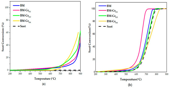 Figure 9a depicts the soot conversion profiles in the absence of oxygen for BM-Cex samples, where it is observed that all perovskites catalyze the soot oxidation (if they are compared with the profile obtained in the absence of catalyst), showing a shift of the soot conversion profile towards lower temperatures as the Ce content increases. In the presence of perovskites, the reaction seems to occur with the oxygen evolved from the samples, which is mainly β-O2, as the soot conversion is mainly promoted at temperatures higher than 650 °C (see Figure 4). Consequently, the temperature for soot conversion directly depends on the temperature at which the β-O2 starts to be evolved from the samples; that is, at T > 700 °C. From the BM-Cex series, BM-Ce0.6 is the most-active catalyst as it features the highest soot conversion values at T > 700 °C. T10% data in Table 7 evidence that BM-Ce0.3 and BM-Ce0.6 perovskites present the lowest T10% values among the BM-Cex samples. Note that these two perovskites evolve a higher amount of oxygen during the O2-TPD tests than the BM-Ce0.1 and BM raw samples, probably due to the contribution of Ce(IV)/Ce(III) reduction as they present a higher amount of Ce(IV), both on the surface (as revealed via XPS) and in the bulk (due to the presence of CeO2, as identified via XRD), than BM-Ce0.1 and BM.