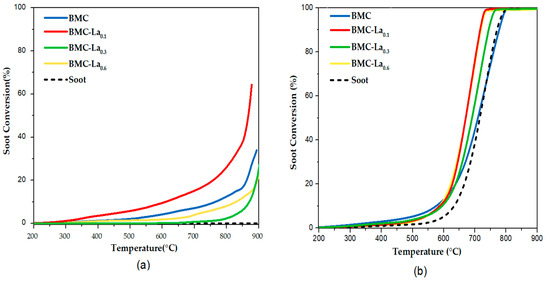 Finally, by comparing the catalytic performance in soot oxidation of the two tested series, BM-Cex and BMC-Lax, and in the two conditions used, the following conclusions are reached: