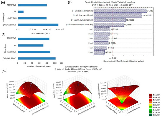 Influence of the type of HS-SPME fiber coating on the extraction efficiency of VOCs in cocoa honey samples considering total peak area (A) and number of detected peaks (B). Pareto chart of standardized effects of the 24 factorial design for total chromatographic peak area (C). Response surface obtained by central composite using the quadratic model in the optimization of the conditions (temperature T, °C, time t, min, and stirring speed, rpm) for extraction of the volatiles in cocoa honey by HS-SPME (D).