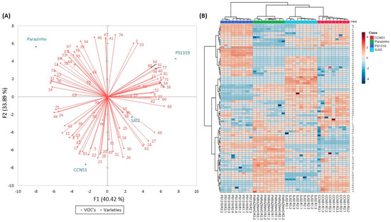 In this study, the samples differed in the number of volatile organic compounds detected in each variety (Table 1). In general, the SJ02 and PS1319 varieties had the highest number of volatiles (72 and 70 compounds, respectively), followed by Parazinho and CCN51 (67 and 63 compounds, respectively). Among the detected compounds, the chemical classes included volatile acids (6), alcohols (8), aldehydes (13), esters (21), ketones (5), monoterpenes (10), oxygenated monoterpenes (7), sesquiterpenes (5), oxygenated sesquiterpenes (4), and others (4) across the four varieties.