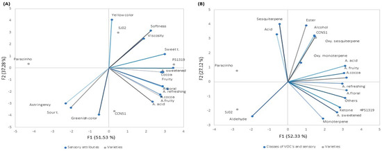 Figure 3B reveals that the CCN51 variety was rich in VOCs, predominantly composed of acids, sesquiterpenes, esters, oxygenated sesquiterpenes, and oxygenated monoterpenes, exhibiting sensory attributes such as acidic, fruity, cocoa/cocoa pulp, and minty/refreshing aroma. In samples of cocoa liquor of the CCN51 variety, according to Rojas et al. [20], the main types of compounds identified were aldehydes, ketones, alcohols, pyrazines, esters, terpenes, acids, and lactones. The PS1319 variety demonstrated a predominance of ketones, monoterpenes, and other volatile organic compounds with a refreshing/minty, floral, and sweet aroma. According to Rodrigues-Campos et al. [26], some ketones are known to impart floral notes to cocoa. The SJ02 variety exhibited a predominance of aldehydes, while Parazinho stood out for the presence of acids and sesquiterpenes, lacking aroma descriptors.
