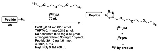 The CuAAC has been applied to small molecular weight molecules up to nanoparticles producing a wide diversity of 18F-labeled molecules. Interestingly, the partners can be reversed and when considering peptides, amino acids modified with a propargyl or an azide group are available, and they can be inserted during the solid-supported production of peptides. The same is true for the second partner of the click reaction, and many derivatives can be synthesized or are commercially available [,]. We decided to use azido-peptides and to react them with a propargylic triethylene glycol derivative. Peptides were synthesized on solid support and further modified by the introduction of an azido-lysine on the N-terminus for 3A, 4A and with a pentanoic azide for 5A. The propargylic triethylene glycol ([18F]2A) was chosen for its in vivo stability, its solubility in water and organic solvents and also for its higher boiling point than shorter glycol or propargylic alkanes. [18F]2A was previously involved in “hot” CuAAC reactions with small molecular weight azides or even an azido-RGD peptide [,,]. In all cases, a large amount of copper salt was used (1.5–2.5 mg) with 1–2 mg of azide to reach moderate to good yields (30–69% decay corrected yields).