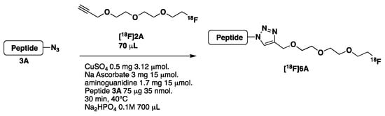 The conditions had then to be optimized without a ligand (mainly by increasing the copper salts content). A radiochemical conversion of 98.8% was obtained when heating at 40 °C during 30 min a solution containing 0.5 mg of CuSO4 (3.12 μmol), sodium ascorbate for copper(II) reduction (3 mg, 15 μmol), aminoguanidine used to trap reactive species of reduced ascorbate (1.7 mg, 15 μmol) and 75 μg (35 nmol) of peptide 3A in 700 μL of Na2HPO4 (0.1 M) mixed with 70 μL of [18F]2A in ethanol (Scheme 5, see also Supplementary Materials page 15 and Figure S17).