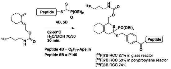 The reaction was carried out in the same conditions with peptide 4B in a glass tube, and after 30 min, a radiochemical conversion of 27% was obtained (with 7% impurities and 65% of remaining [18F]2B). The tendency of apelin-C8F17 to stick on glass walls is well known in our laboratory, and therefore, the reaction was tested again under exactly the same conditions but in a 2 mL polypropylene tube. A conversion of 50% was obtained in 30 min at 62–63 °C (remaining [18F]2B 40%, impurities 10%), and 63% radiochemical conversion was obtained after 45 min of reaction (Supplementary Materials pages 16–17 and Figure S20).