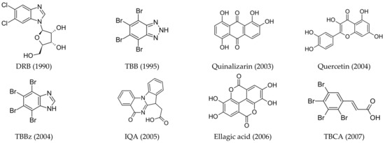 Structures of the most relevant CK2 inhibitors in chronological order of discovery. The date of discovery is given in brackets.