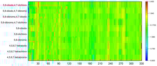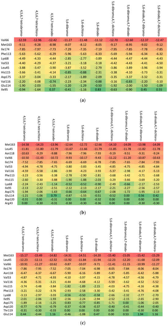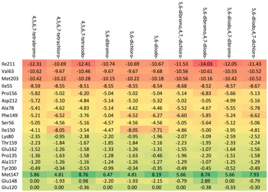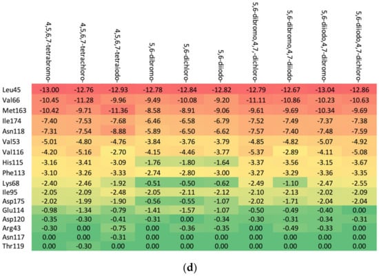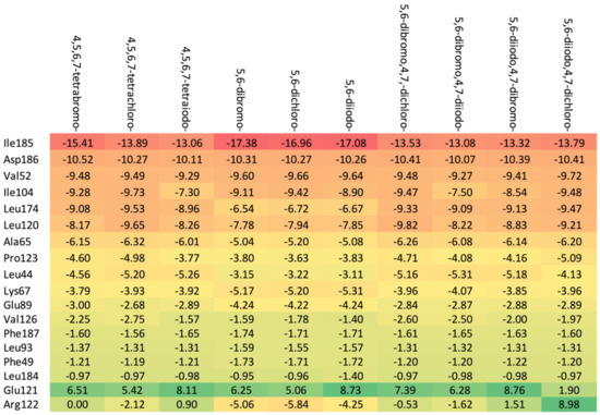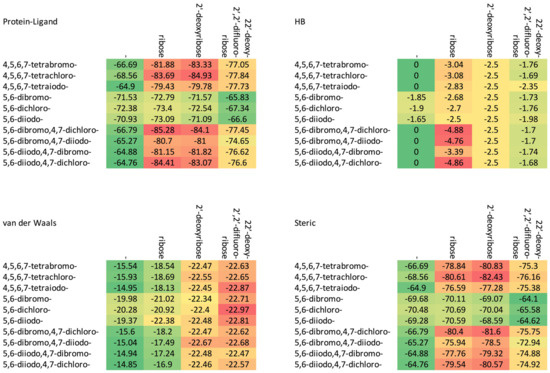 The increase in the binding affinity of the ligands with the 2′-deoxy-2′,2′-difluoro-ribose moiety substituted at N(1) of the polyhalogeno-1H-benzimidazole ring is clearly evident. The protein–ligand binding energy is found to be strongly dependent on contributions from steric interactions and hydrogen bonds, while the binding affinity is found to be strongly affected by the van der Waals interactions. The heatmaps shown in Figure 4 help to reveal these relationships. Both the halogens of the aglycone and glycone moieties play a crucial role in the ligands under study as they significantly influence the electron density distribution within the ligand.
