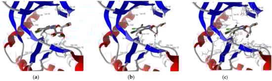 The best poses for three series of the ligands differing by glycone moiety: (a) ribose, (b) 2′-deoxyribose, and (c) 2′-deoxy-2′,2′-difluoro-ribose. The hydrogen bond between the ligand and the Asn118 residue of CK2α is shown with a blue dashed line.