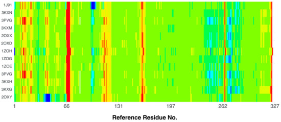The heatmaps visualization, shown in Figure 6, permits the assessment of how alterations in the binding specifically change the binding efficacy of individual protein residues with the ligand.