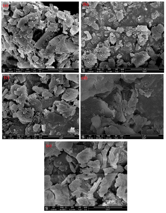 SEM images of (a) Indigo-PANI, (b) Indigo-PNA, (c) Indigo-POPD, (d) Indigo-PPy, and (e) Indigo-PTh.