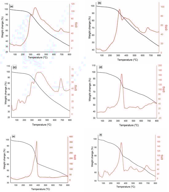 TGA-DTG profiles of (a) pure indigo dye, (b) Indigo-PANI, (c) Indigo-PNA, (d) Indigo-POPD, (e) Indigo-PPy, and (f) Indigo-PTh.