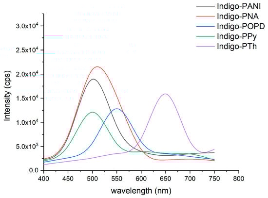Fluorescence emission spectra of Indigo-PANI, Indigo-PNA, Indigo-POPD, Indigo-PPy, and Indigo-PTh.