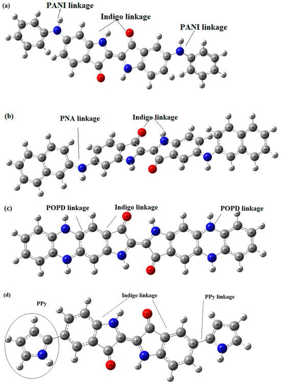 The Indigo-dye-modified oligomers were optimized by inserting one monomeric unit of dye and two units of monomer flanked on either side of the dye molecule, as shown in Figure 5a–e. The optimized geometry of Indigo-PANI, depicted in Figure 5a, showed a planar configuration. The optimized geometry of Indigo-PNA, shown in Figure 5b, exhibited a twisted configuration. The optimized geometries of Indigo-POPD, Indigo-PPy, and Indigo-PTh, shown in Figure 5c–e, also revealed a planar configuration with no visible twisting upon insertion of the Indigo dimer.