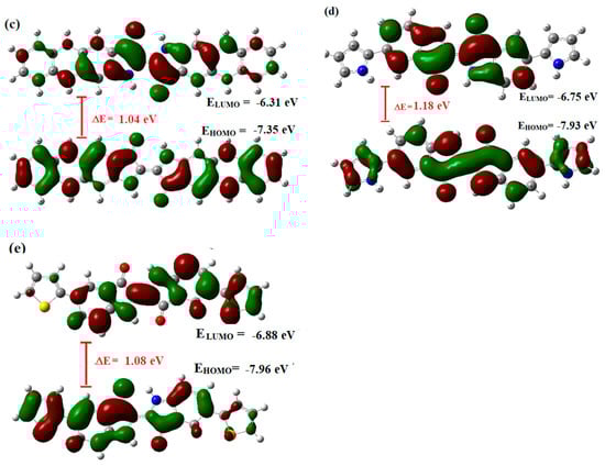 HOMO-LUMO energies of (a) Indigo-PANI, (b) Indigo-PNA, (c) Indigo-POPD, (d) Indigo-PPy, and (e) Indigo-PTh.