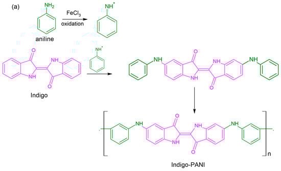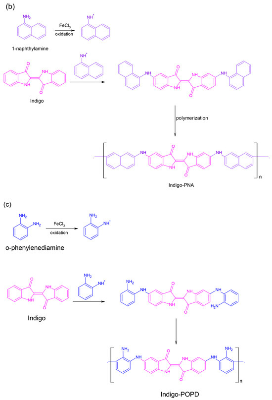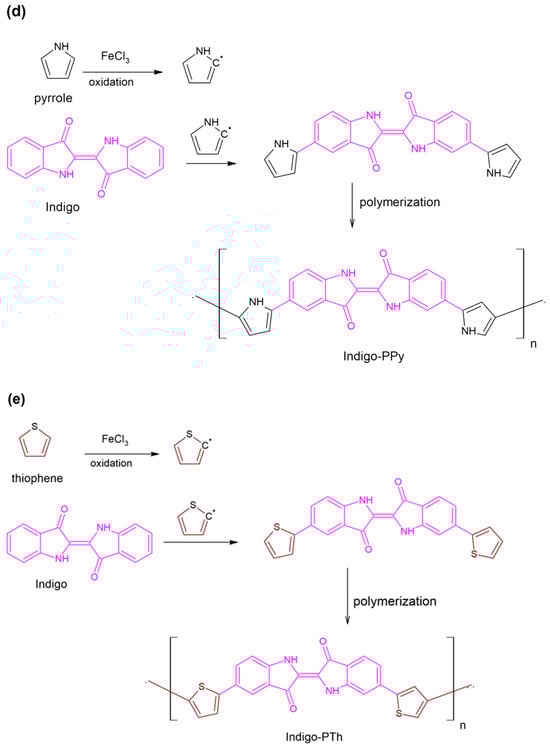 Mechanism of polymerization of (a) Indigo-PANI, (b) Indigo-PNA, (c) Indigo-POPD, (d) Indigo-PPy, and (e) Indigo-PTh.