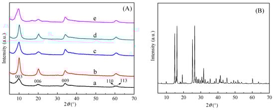Experimental XRD patterns of (A): (a) BA-LDHs, (b) BA-LDHs-Cd, (c) BA-LDHs-Cu, (d) BA-LDHs-Cr and (e) BA-LDHs-MB; (B): BA.