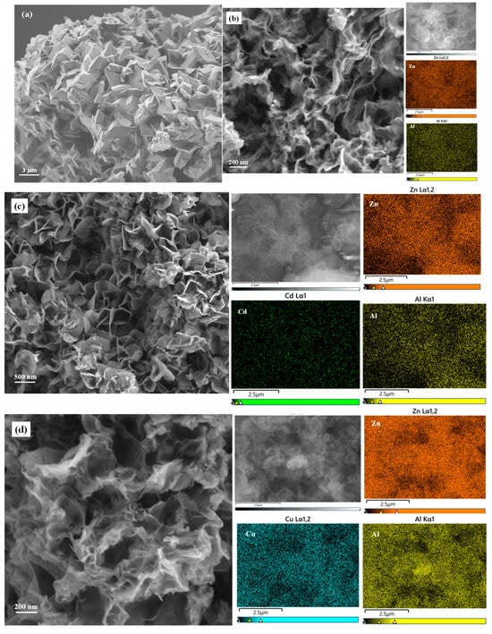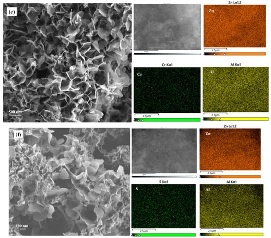 The SEM image of NH4B5O8 · 4H2O (Figure 2a) presents the morphology of a rhombic system with two vertebrae. When NH4B5O8 · 4H2O was heated above 90 °C, it decomposed and released ammonia, which provided an alkaline environment when preparing BA-LDHs, without adding additional alkaline substances. This method of preparing BA-LDHs was similar to urea hydrolysis, which has rarely been reported. Before adsorption, BA-LDHs’ appearance was composed of many small flakes piled up (Figure 2b). However, after the adsorption of Cd(II), Cu(II), Cr(VI) and MB, the morphology of samples changed significantly. The BA-LDHs-Cd and BA-LDHs-Cu showed that the pieces were connected to each other, with loose porous and folded states (Figure 2c,d). The morphology of BA-LDHs-Cr and BA-LDHs-MB had some large sheet structures (Figure 2e,f). The above results were consistent with those of XRD characterization (Figure 1). In the element distribution mapping of the adsorbed samples, it can be seen that Cd(II), Cu(II), Cr(VI) and S (the S element was the MB containing a detection marker) are detected, respectively. Moreover, the surface area of the BA-LDHs was 101.31 m2·g−1. This was agreed with the reported ZnAl-LDH-BC600 (102.56 m2·g−1), which was from the ZnAl-LDHs modified by biochar at 600 °C []. The pore size (Dp) and pore volume (Vp) of BA-LDHs were 6.67 nm and 0.152 cm3·g−1, respectively. This demonstrated that the above structure of BA-LDHs could provide a good adsorption site.