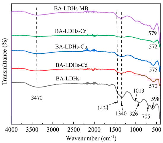 The FT-IR spectra for BA-LDHs, BA-LDHs-Cd, BA-LDHs-Cu, BA-LDHs-Cr and BA-LDHs-MB are presented in Figure 3. There is an intense band around 3470 cm−1 in all samples, which corresponds to the stretching of the hydroxyl bond (O-H), relative to both the hydration water of the interlayer space and the hydroxyl group present in the LDH layers []. The band at 1340 cm−1 was assigned to the stretching of CO32− in the samples, which was due to dissolved CO2 in the aqueous medium []. The stretching vibration of the B-O group manifested as a shoulder peak at 1434 cm−1 []. Additionally, the vibration signals at 1013, 926, 705 and 598 cm−1 could be attributed to M–O (Zn-O and Al-O) []. Moreover, the vibrational signals at 598 cm−1 in BA-LDHs and the phenomenon of redshift, which occurred in all samples after adsorption, indicated that the adsorption mechanism was not consistent in each adsorption system (see Section 3.4. Adsorption mechanism).