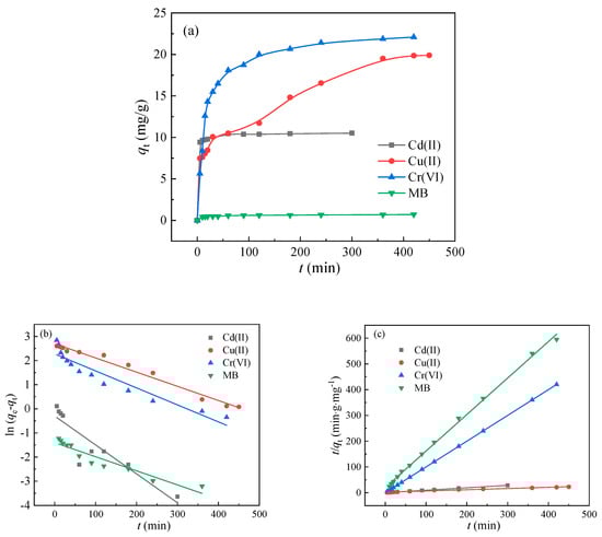 The adsorption amount and adsorption speed of the adsorbents on the pollutants could be deduced by kinetic behavior, so as to determine the underlying mechanism. The adsorption kinetics of BA-LDHs to Cd(II), Cu(II), Cr(VI) and MB are shown in Figure 4a. As can be seen from the adsorption kinetics curves of BA-LDHs for Cd(II) and MB, the adsorption equilibrium could be quickly reached within 30 min. However, the adsorption of BA-LDHs for Cu(II) and Cr(VI) comprised two phases of fast adsorption and slow adsorption. At the beginning of the 100 min, the adsorption capacity increased sharply with the increase in adsorption time and then gradually slowed down and reached saturation. The reason for this phenomenon could be attributed to an abundance of unoccupied active sites on the BA-LDHs at the beginning of the reaction [], whereas as the reaction continued, the majority of the sites on BA-LDHs were occupied by Cu(II) and Cr(VI), until they were filled [].