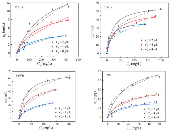 An adsorption isotherm is an important tool to obtain the information about the properties of adsorption layers and the interaction between adsorbed and adsorbed substances []. Langmuir and Freundlich, as broadly accepted isotherm models, were introduced in the present study to elaborate the adsorption behavior of Cd(II), Cu(II), Cr(VI) and MB onto BA-LDHs. The Langmuir model is based on the premise that monolayer adsorption occurs on a uniform surface, and it could be used to predict the maximum adsorption capacity of the adsorbent []. According to the Freundlich model, the surface of the adsorbent is heterogeneous, and the adsorbent is adsorbed in multiple layers []. The Langmuir and Freundlich isotherms were used for the nonlinear fitting of the above adsorption equilibrium data, respectively. The results showed that both Langmuir and Freundlich isotherms could describe the adsorption isotherms of the adsorption system under each Cs (Figure 5). Table 2 lists the fitting values of the model parameters by Langmuir and Freundlich isothermal equations. It could be seen that the saturation adsorption qm decreases with the increase in Cs, which was known as the solid concentration effect [,,]. It was found that other parameters also change with the change of Cs. However, neither the Langmuir nor Freundlich isotherm could describe or predict this phenomenon.