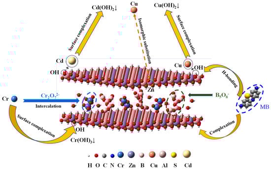Overall, taking into account the characterization analysis and batch adsorption experimental results, the adsorptions of Cd(II), Cu(II), Cr(VI) and MB on BA-LDHs were complex process concerning several specific mechanisms. The apparently optimized porosity structure and expanded surface area (BET and SEM) of BA-LDHs yielded an abundance of available sorption sites for Cd(II), Cu(II), Cr(VI) and MB to be filled in the pores channel. The Freundlich isotherm model matched experimental data well, illustrating that the surface sites of BA-LDHs were heterogeneous, and its entrapment of Cd(II), Cu(II), Cr(VI) and MB could be driven by multilayer physical adsorption. According to the saturated adsorption capacity (qm) of BA-LDHs for pollutants, the adsorption capacity for each pollutant is Cr(VI) > Cu(II) > Cd(II) > MB at Cs = 2 g·L−1 (Table 2). Briefly, the main mechanism of Cr(VI) removal from water was tied to the isomorphic substitution of Cr6+ and Zn2+ and the intercalation of Cr2O72−, except Cr(OH)3 precipitation. The former is because the radius of Cr6+ (0.044 nm) is smaller than the radius of Zn2+ (0.074 nm), and the latter is because the successful intercalation of B5O8- (0.86 nm × 0.59 nm × 0.18 nm) in the early stage opens a channel for Cr2O72− (0.55 nm × 0.25 nm × 0.21 nm) to enter. The main mechanism of removal of Cu(II) from water is isomorphic substitution, except Cu(OH)2 precipitation, mainly because the ionic radius of Cu(II) (0.073 nm) is very close to that of Zn2+ (0.074 nm). The main mechanism of Cd(II) removal from water is Cd(OH)2 precipitation on the surface of the adsorbent. The main mechanism of MB removal was on account of H-bonding and complexation. A suggested reaction pathway for the adsorption is presented in Figure 6.