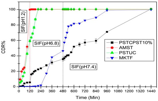 Comparative cumulative drug release (CDR%) of mesalamine in changing over media from native finger millet starch tablet (AMST), chemically modified finger millet starch uncoated tablet (PSTUC), chemically modified finger millet starch tablet with 10% w/w coating of chemically modified mandua starch (PSTCPST10%), marketed tablet (MKTF, mesalamine: 800 mg) (Ref. [22]).