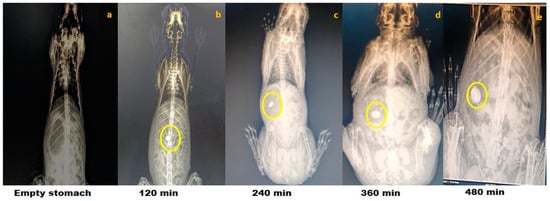 An ideal investigative tool for tracking oral dosage forms of pharmacologically active components is X-ray radiography. These procedures have numbers of benefits over scintigraphy and magnetic resonance imaging (MRI) because it is simple to access in most research centres or veterinary teaching hospitals; does not necessitate general anaesthesia in animals; can be executed without manual restraint, preventing radiation exposure to staff; and is economical compared with other imaging technologies [42,43]. X-ray radiography also has a myriad of benefits over MRI and scintigraphy [44]. Using barium sulphate as a pharmaceutical carrier, its transition through the gastrointestinal system can be observed visually [45]. The high density and insolubility of barium sulphate in the GIT are two remarkable characteristics [46]. Orally administered tablets containing barium sulphate can be monitored in vivo because it is an inert substance that does not interact with other excipients used in tablet [47]. The aim of the present study was first to scrutinise the colon-targeting competency of the developed tablet using barium sulphate as radio opaque material in X-ray imaging.