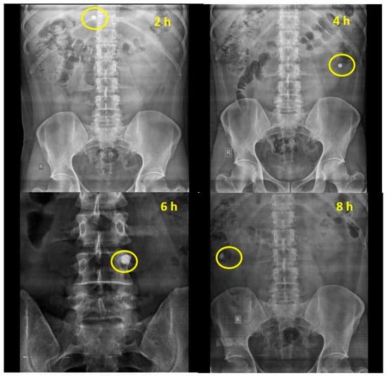 To conduct the roentgenography analysis, prior consent from the human ethical committee of Rishikul Campus, Haridwar, Uttarakhand Ayurved University, Dehradun, India, was obtained, and the study was performed under expert guidance after written patient consent (Approval Nos: UAU/RC/IEC/2019/04-02-45 and CTRI/2021/09/036142). Four healthy, male adult non-smokers, non-alcoholic volunteers 20 to 35 years of age were screened for the investigation. All the volunteers were found fit for the study as declared by the physician. All the volunteers abstained from consuming any other medicine for at least one week prior to study initiation. The subjects underwent overnight fasting before the day of test formulation administration [49]. After 12 h fasting, each subject orally swallowed chemically modified mandua starch-coated barium sulphate tablets with sufficient water. X-ray images of the GIT were captured using an X-ray machine (Epsilon) at intervals of 0 h, 2 h, 4 h, 6 h and 8 h to monitor the location, integrity and movement of the tablet in the GIT [50,51].