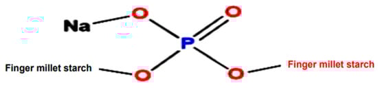 Mandua starch was extracted as per our earlier reported method [11] using the alkali isolation approach. Further, the isolated starch was modified using sodium trimetaphosphate and sodium tripolyphosphate in a crosslinking phosphorylation mechanism as per our earlier reported procedure in which the mechanism of phosphorylation was presented [18]. Photographic images of the isolation and modification of mandua starch are shown in Figure 4. The proposed structure of distarch monophosphate formed after the phosphorylation process is shown in Figure 5.