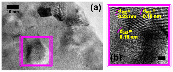 Finally, Figure 4a is an HRTEM image taken from the image upside area shown in Figure 3a, exhibiting the interplanar spacing from synthesized nanostructures. Figure 4b is a higher-magnification image from a Figure 4a region (indicated by the continuous triple line in violet color). It shows the 0.23 nm and 0.16 nm lattice spacing attributed to the combeite phase, while 0.10 nm is the interplanar spacing of the nepheline phase. This corroborates with the SAED analysis (Figure 3b) that shows combeite and nepheline are coexisting. Moreover, the size of the nanoparticles increases with the time of thermal treatment (please refer to Figure 2c and Figure 4a, showing that the sample was treated with 2 h of thermal treatment and started the nucleation process, while thermal treatment for 5 h was more favorable to increase the crystallization of the sample and to promote phases’ coexistence).