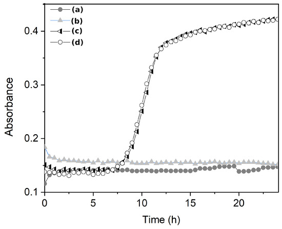 Optical density measurements of bacteria growth (E. coli, CFU) with a contact time of 30 min for thermally treated flint glass (720 °C during 2 h). Samples (a–c): flint glass (without thermal treatment); (d): control experiment.