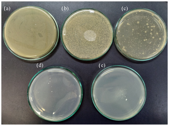 Bacterial growth of E. coli (106 CFU) after contact time with the glass-ceramic of (a) 0 min, (b) 10 min, (c) 15 min, (d) 30 min, and (e) 60 min.