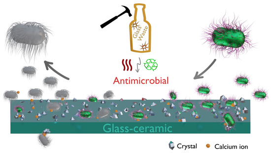 The biocide activity of the silica-based bioactive glass-ceramic substrate, 45S5 BioglassTM, was reported by Cabal et al. [9]. The authors noticed that glass-ceramic scaffolds could act directly against common bacteria without metallic nanomaterials such as silver or copper coatings [9,10]. In this case, only the combeite phase (Na2Ca2Si3O9) showed antimicrobial activity due to the calcium release in the medium. However, the authors also argued that the calcium-rich glass phase can be involved in antimicrobial activity [10]. Moya et al. reported the synthesis of calcium oxide-rich glass with antimicrobial activity from environmentally friendly raw materials [11]. Soda-lime glass-ceramics were successfully used to obtain biocompatible materials for dental applications that can prevent implant infections [12]. Furthermore, in dentistry, root canal filling is performed with tricalcium silicate-based materials that not only promote antimicrobial activity but also act as a bioactive material that can induce the formation of hard tissue. As a general trend, calcium release is positively correlated with enhanced antimicrobial performance [13,14]. Usually, antimicrobial activity is achieved by the modification or synthesis of designed glass compositions, which can be a drawback for some applications [10,15]. The development of a solvent-free route from inexpensive raw materials or waste without the addition of transition metals (e.g., silver or copper) is highly desirable [16].
