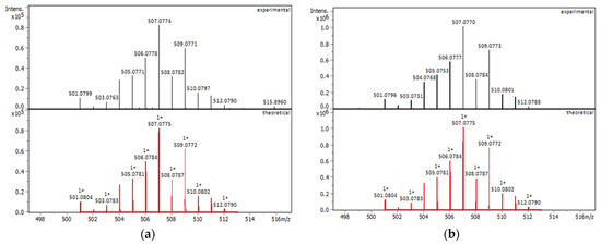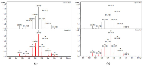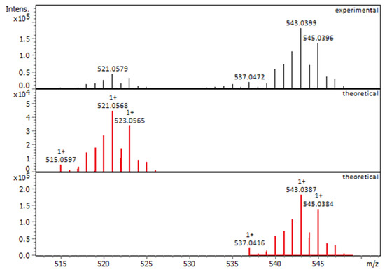 Finally, for 3-Cl and 3-PF6 complexes, the dominant peaks at m/z 535.0726 and m/z 535.0721 that were detected are those assigned to [C26H26ClN2O2Ru]+ with mass error at 0.1 mDa and at −0.4 mDa, respectively, and good isotopic pattern fitting (Figure 6).