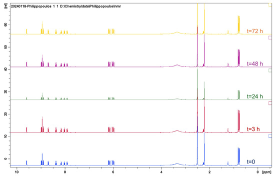 The cytotoxicity studies of the organometallic ruthenium(II) complexes 1-Cl, 2-Cl, and 3-PF6 were carried out in dimethyl sulfoxide (DMSO) while 3-Cl was dissolved in water. According to UV–Vis spectroscopy, complexes 1-Cl and 2-Cl are stable in the media that are used for the biological assays (Figures S25–S26), while 3-Cl undergoes hydrolysis approximately 3 h after with isosbestic points at 276 nm and 322 nm, respectively (Figure S27). The stability of 1-Cl (Figure S28) and 2-Cl was also checked by means of 1H NMR spectroscopy in DMSO-d6, revealing that both complexes are stable in this medium. Notably, for 2-Cl, 1H NMR monitoring was followed over a period of several hours (more than 72 h), showing its remarkable stability in this medium (Figure 7). In any case, for the biological assays, freshly prepared solutions were prepared that were utilized within approximately 5–10 min.