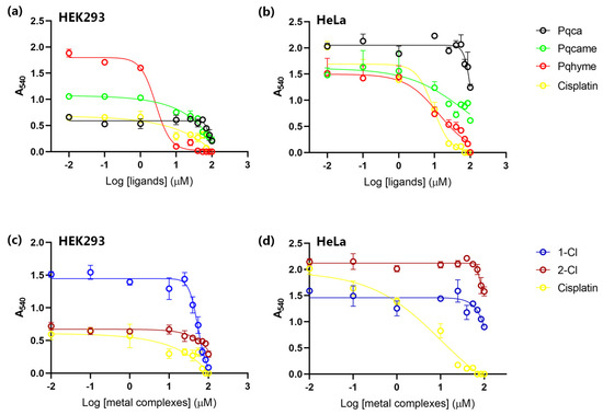Viability curves comparing the ligands (a,b) or the complexes (c,d) with cisplatin in HEK293T (a,c) and HeLa (b,d) cell lines.