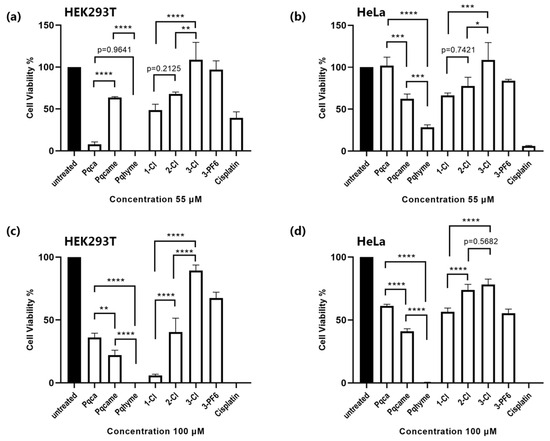 Cell viability effects in HEK293T (a,c) and HeLa (b,d) cells following treatment with the compounds with an intermediate (55 μM, (a,b)) or the maximum (100 μM, (c,d)) concentration used in the study. Statistics were performed comparing all ligands (Pqca, Pqcame, Pqhyme) and all Ru complexes (1-Cl, 2-Cl, 3-Cl) using one-way ANOVA followed by Tukey’s multiple comparison test. Significant comparisons were marked with asterisks (**** p < 0.0001, *** p < 0.0008, * p = 0.0424, ** p = 0.0022 and 0.094 for 2-Cl vs. 3-Cl in (a) and for Pqca vs. Pqcame in (c), respectively). p values for non-significant comparisons are noted in each graph.