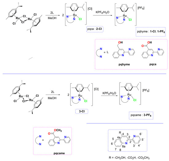 The chlorido ruthenium(II) complexes 1-Cl, 2-Cl, and 3-Cl were prepared in a one-pot reaction, upon treatment of the dinuclear precursor [Ru(η6-p-cymene)(μ-Cl)Cl]2, with two mol equivalents of the corresponding ligand (pqhyme, pqca, and qcame) in dry methanol. The general synthetic route and reaction conditions are presented in Scheme 1. Interestingly, we also noticed that the coordination chemistry of the pqhyme ligand has not been examined in detail [38].